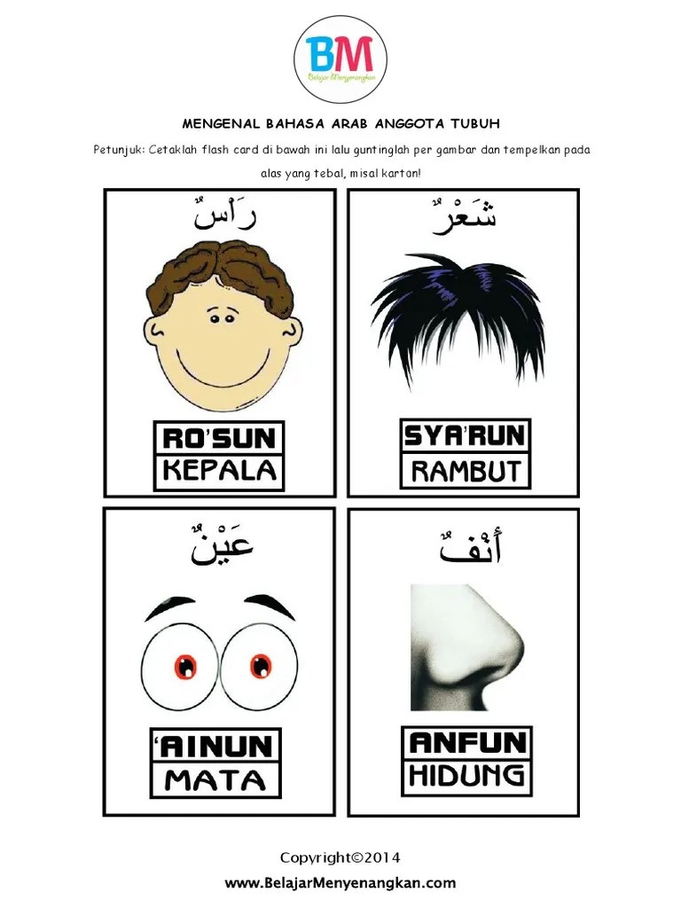 · hidung / أَنْفٌ / anfun. Wajah (face), وَجْهٌ · 4. Kepala / ro'sun / رَأْسٌ · rambut / sya'run / شَعْرٌ · telinga / udzunun / أُذُنٌ · mata / 'ainun / عَيْنٌ · hidung / anfun / أَنْفٌ · mulut / fammun / فَمٌّ · pipi / . Rambut (hair), شَعْرٌ · 2. 75 anggota tubuh manusia dalam bahasa arab dan artinya lengkap · 1. Anggota tubuh dalam bahasa arab · 1. Jidat (forehead), جَبْهَةٌ · 3. Melanjutkan pembahasan tentang kosakata arab, kali ini sayaingin menulis tentang anggota badan. Mata, al ainun /al uyuunu, العين/ العيون. · telinga / أُذُنٌ /udzunun.
